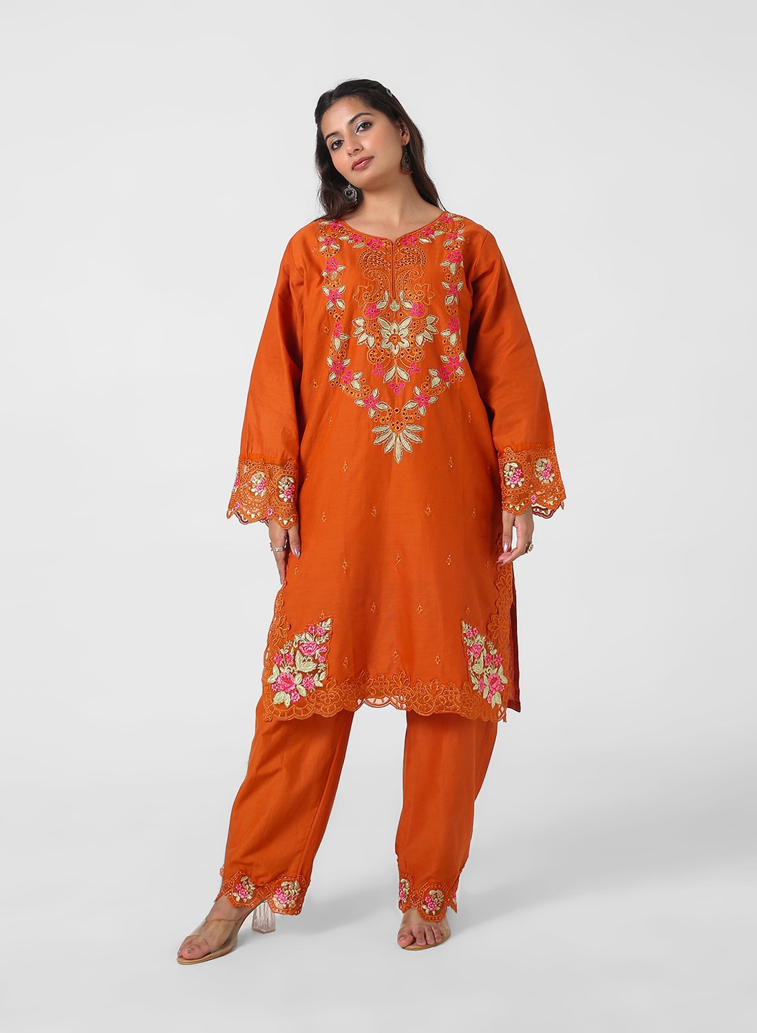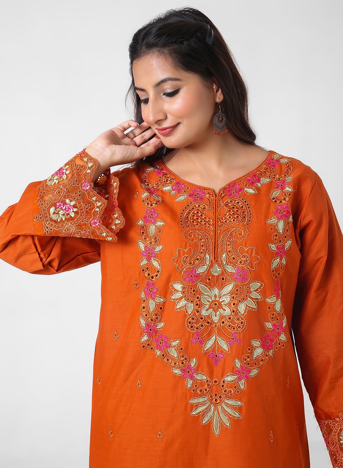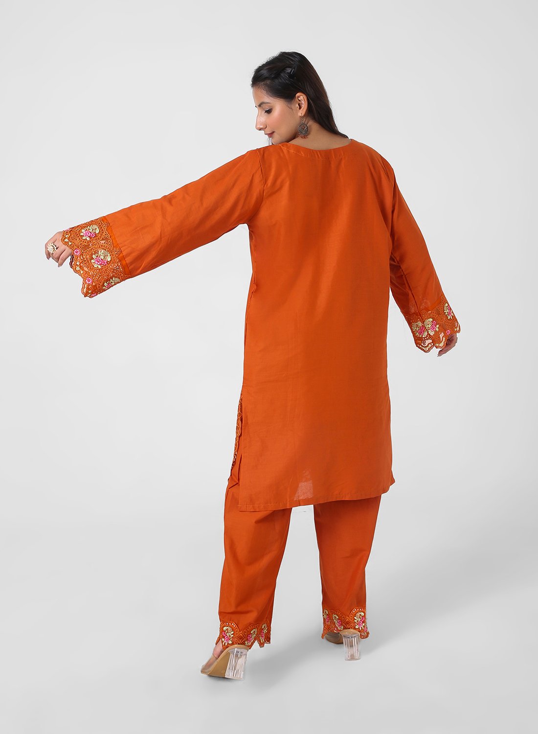 Burnt Orange Embroidered Cotton Suit Set For Women