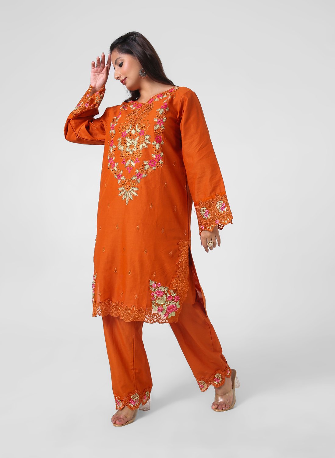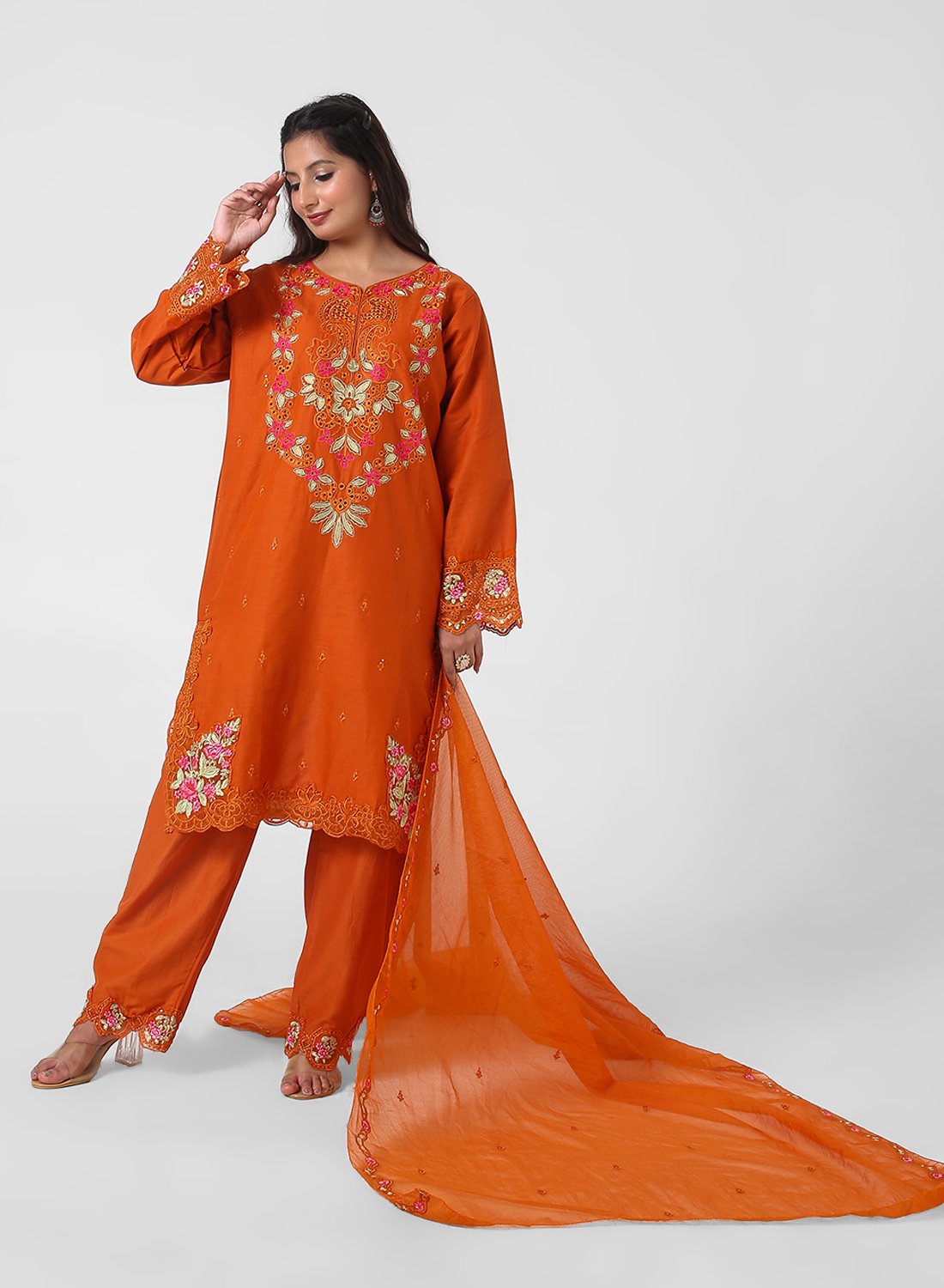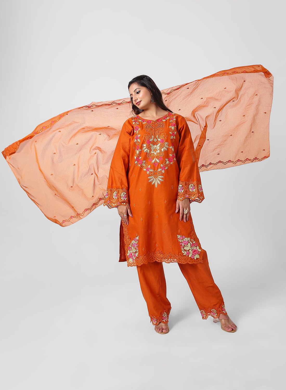 Burnt orange embroidered cotton suit set for women, soft kurta, tapered pants, and a lightweight embellished dupatta crafted for vibrant festive style and comfortable all‑day wear.
