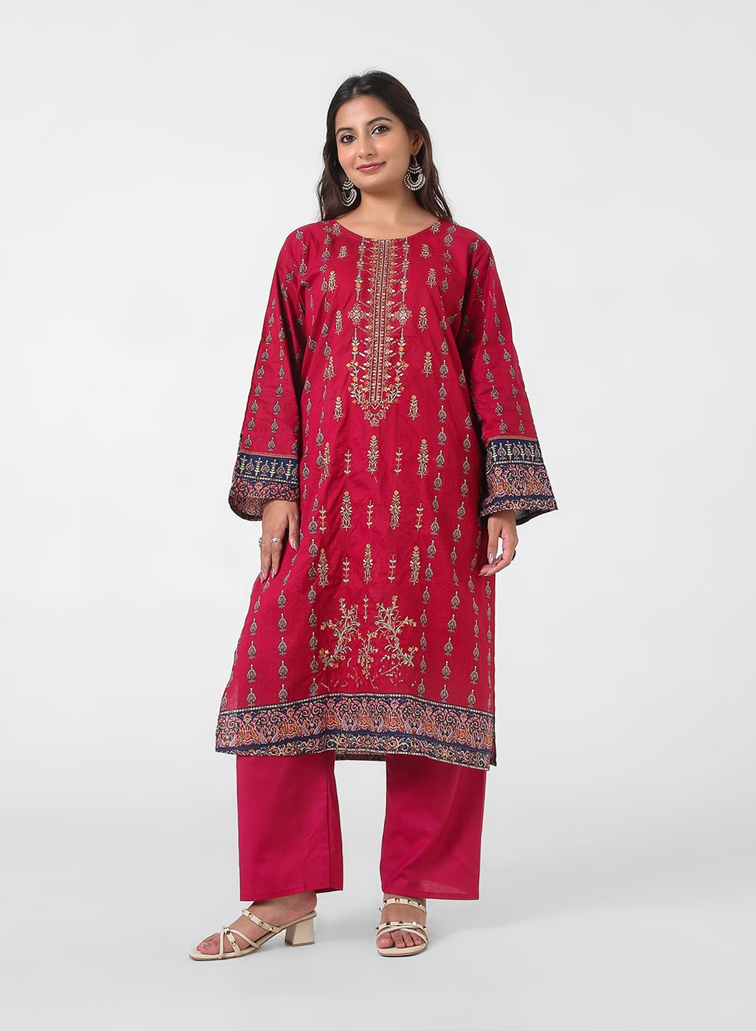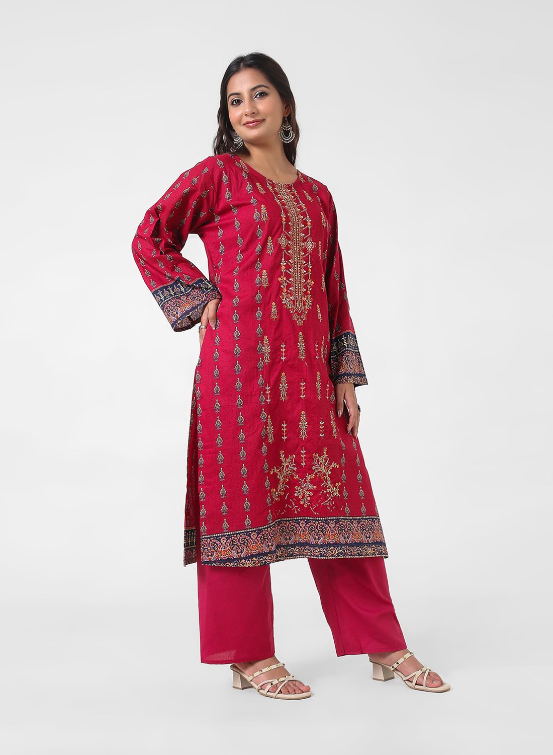 • Straight‑fit kurta with full sleeves offers modest, flattering coverage; coordinated pants create a neat, easy‑movement silhouette.