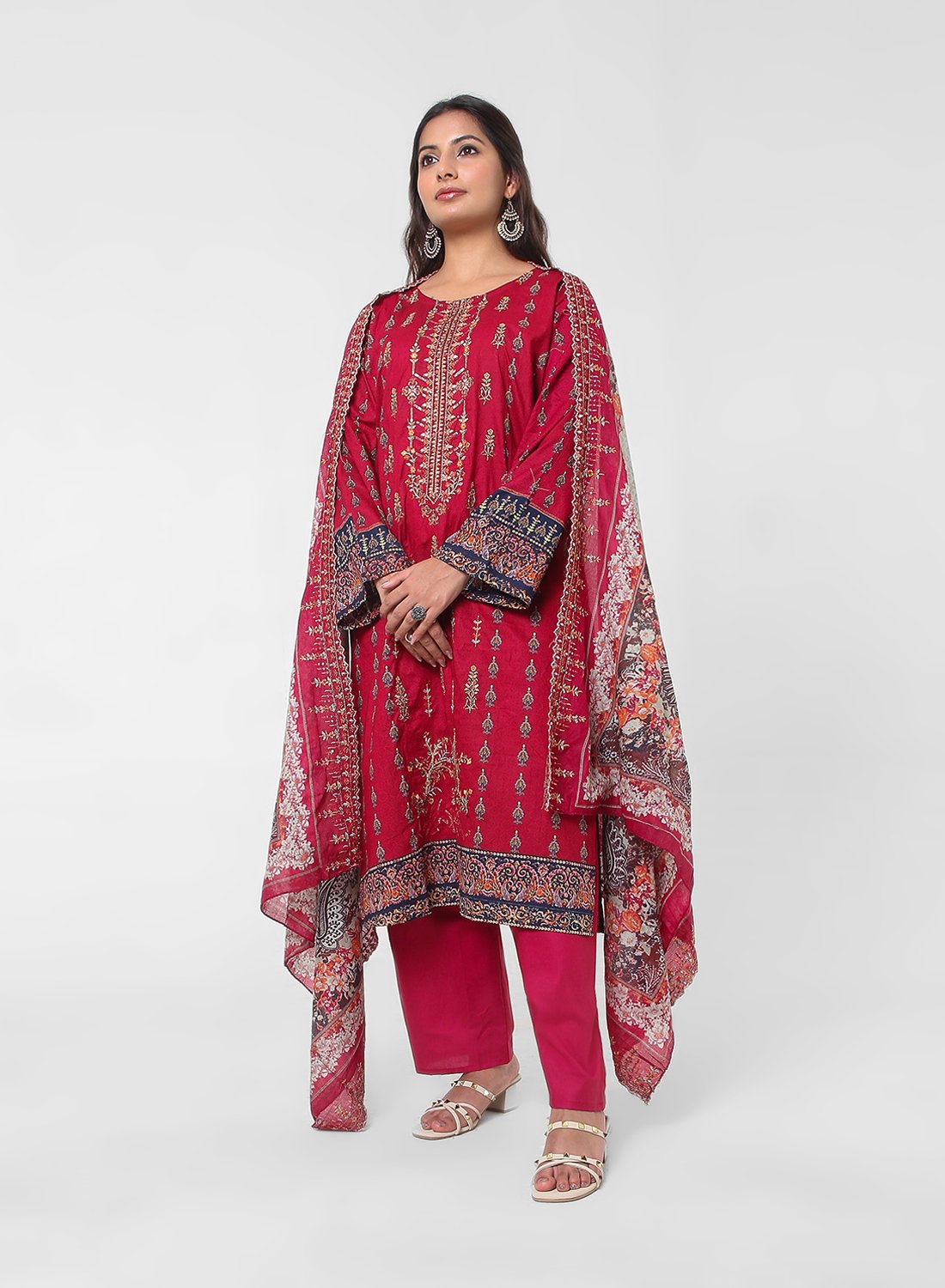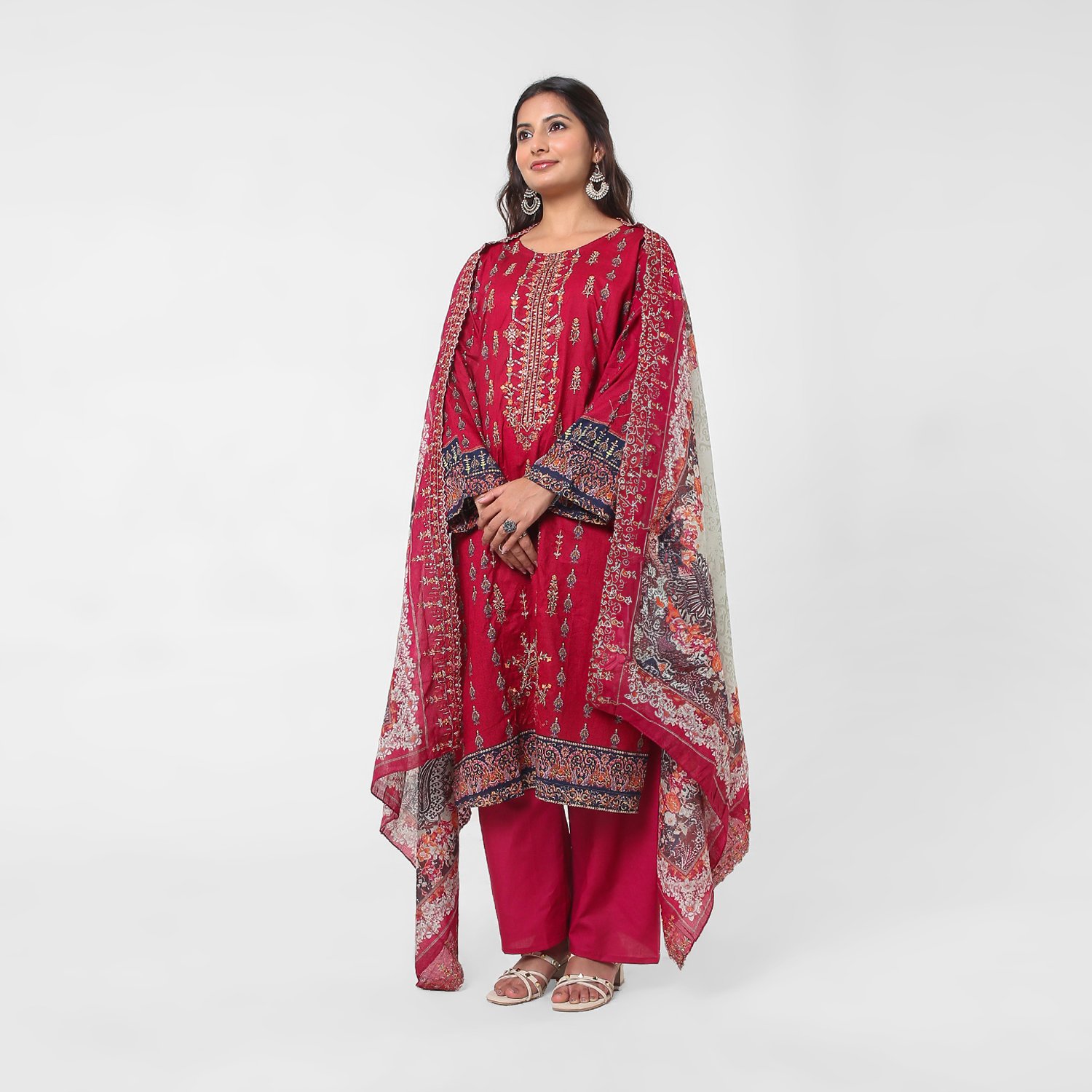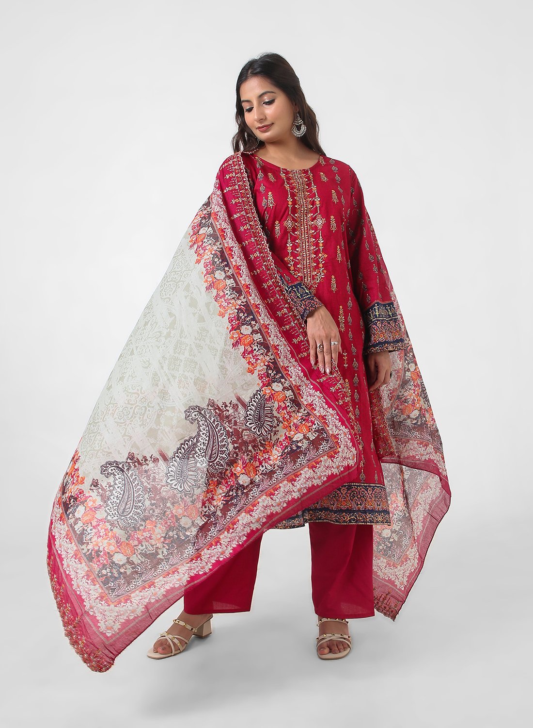 Embroidered wine‑red cotton suit set for women, soft kurta, tapered pants, and a lightweight printed dupatta for elegant everyday and festive dressing.