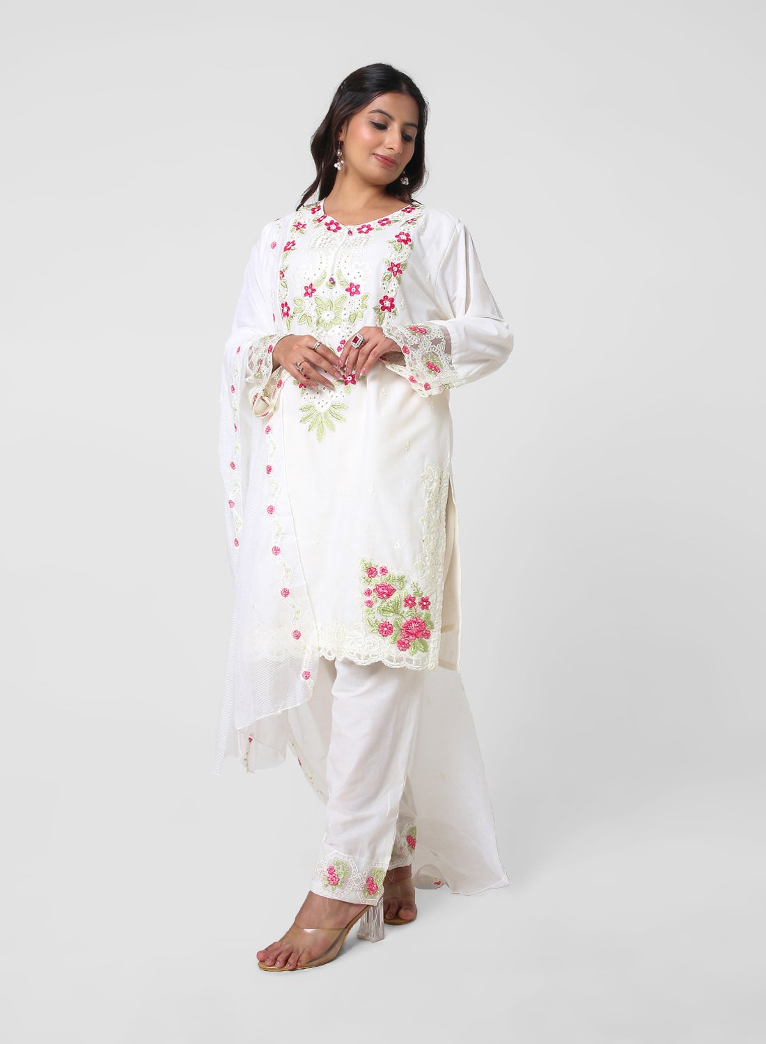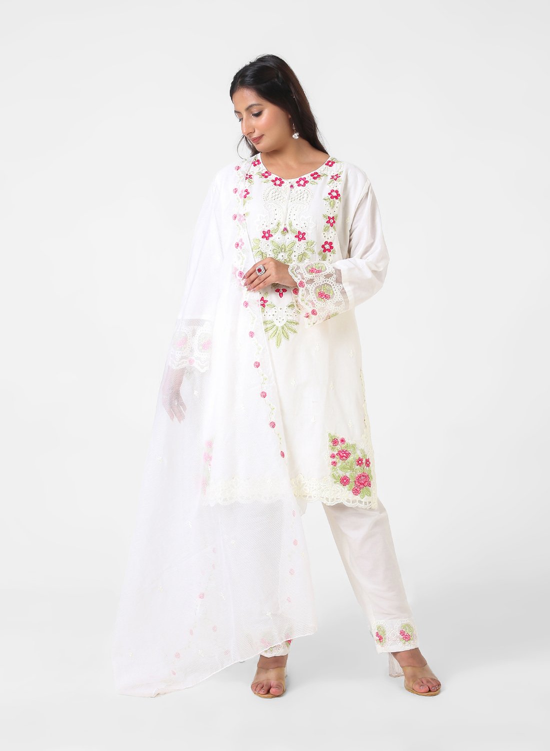 Ivory white embroidered cotton suit set for women, soft kurta, tapered pants, and a lightweight embellished dupatta that delivers fresh, graceful elegance for daytime events and festive occasions.